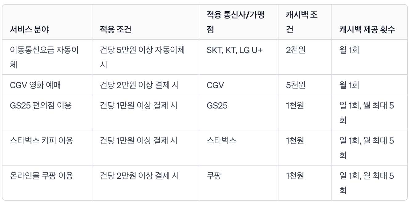 대중교통, 이동통신요금 자동이체, 영화 예매, 편의점, 커피 샵 이용 시 캐시백 혜택과 국내외 간편결제 시 1% 캐시백, 해외이용 시 1.2% 캐시백 등입니다.
