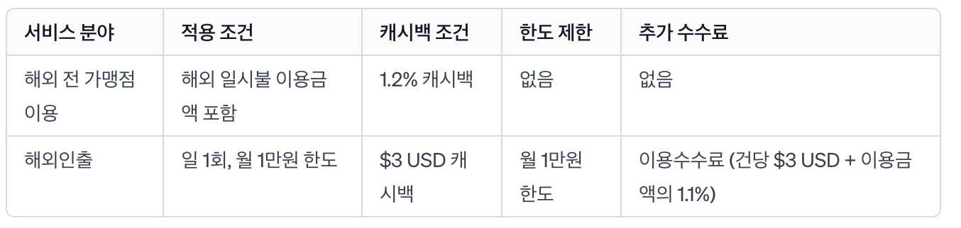 해외 전 가맹점 이용 시 1.2% 캐시백을 받을 수 있으며, 해외인출 시에는 건당 $3 USD의 캐시백을 받을 수 있습니다.