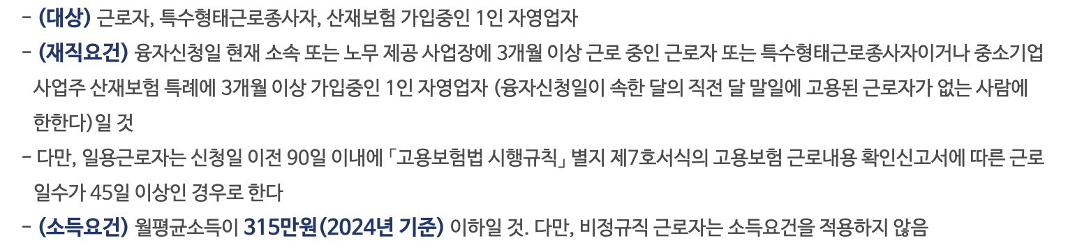 근로자, 특수형태근로종사자, 산재보험 가입 중인 1인 자영업자 중 융자 신청일 현재 소속 또는 노무를 제공하는 사업장에서 3개월 이상 근로 중인 경우, 소득 요건을 충족하는 경우 신청할 수 있습니다.