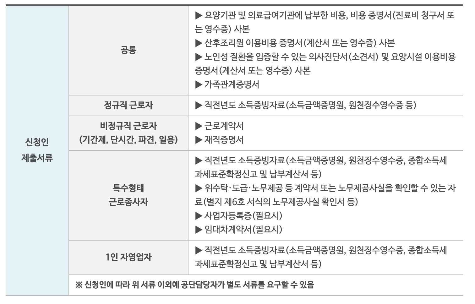 융자 신청 시 제출해야 하는 증빙 서류는 신청인의 유형(정규직 근로자, 비정규직 근로자, 특수형태 근로종사자, 1인 자영업자)에 따라 다릅니다. 공통적으로 요양기관 및 의료급여기관에 납부한 비용 증명서, 산후조리원 이용비용 증명서, 노인성 질환을 입증할 수 있는 의사진단서 등이 필요합니다.