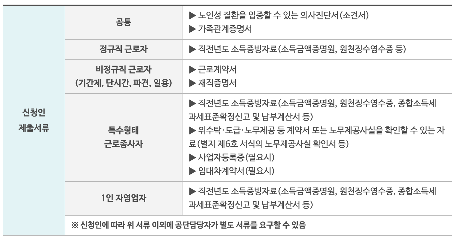 - 모든 신청인 공통: 노인성 질환을 입증할 수 있는 의사 진단서(소견서), 가족관계증명서